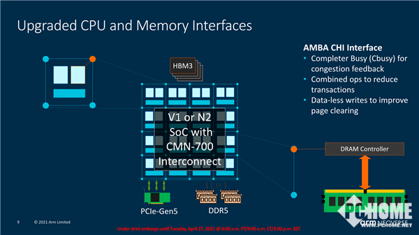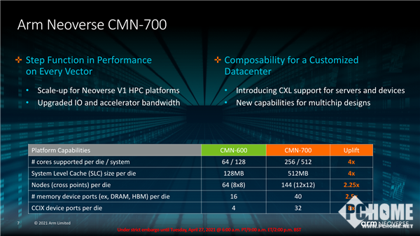 另外,Arm今天同步发布了Arm Neoverse CMN-700,这是业界最先进的Mesh网格互连技术,能充分发挥V1、N2平台的性能、能效优势。