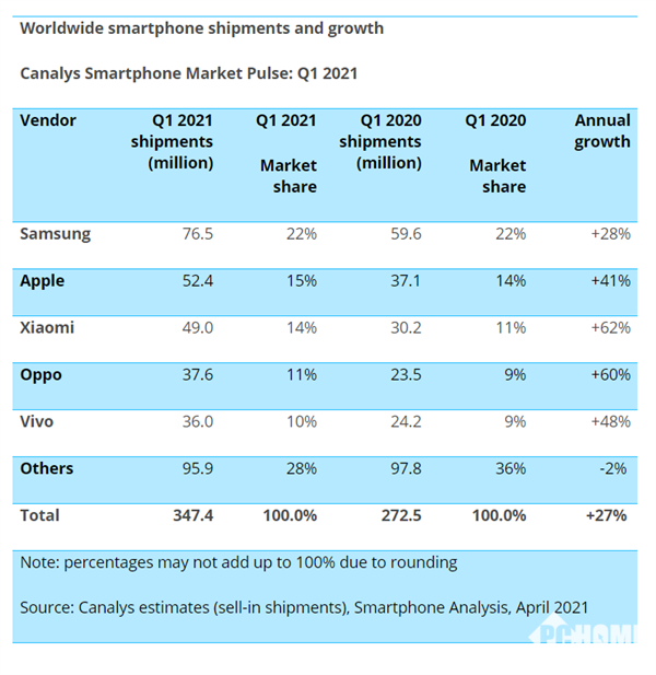 近日,Canalys发布了全球第一季度智能手机的出货量报告。三星以22%的份额排名第一,出货量7650万台。苹果紧随其后,出货量5240万台,份额15%,位居第二。而位居第三的小米创造了有史以来最好的单季度业绩,增长了62%,出货量为4900万部。