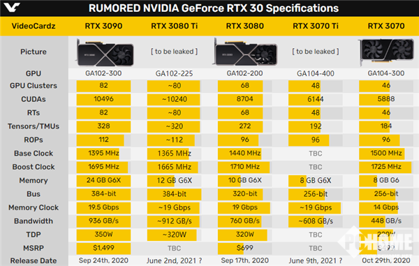 显存方面,RTX 3080 Ti 也会增加到 12GB,不过 GDDR6X 显存的速率可能没有 RTX 3090 的 19.5 Gbps 那么高。