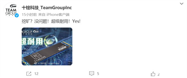 十铨新品T-CREATE EXPERT系列拥有超高的TBW寿命,官方表示,这款产品挖矿也不成问题。据悉,十铨T-CREATE EXPERT系列仅提供1TB、2TB两个容量版本,分别拥有高达6000TB和12000TB的TBW寿命,在此基础上,十铨官方承诺,将提供业界首个长达12年的保修。