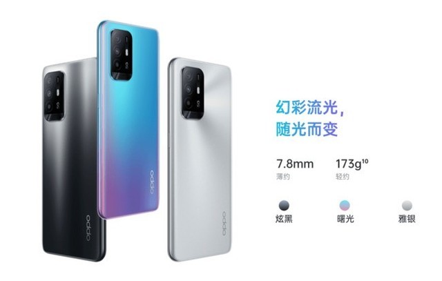 OPPO A95延续了OPPO的轻薄风格,机身厚度只有7.8mm,重量173g左右,单手握持方便,长时间玩游戏也不累。有三种颜色:曙光,雅银,炫黑。