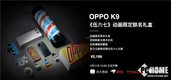 发布会之前,OPPO官方表示与国漫之光《伍六七》达成了合作。今日的OPPO K9系列发布会上IP联名礼盒正式亮相,售价2199元,5月11日正式发售。礼盒内含定制刺客令牌手机壳、定制爆裂街霸蛋、官方主题商店限定伍六七主题等等。