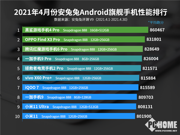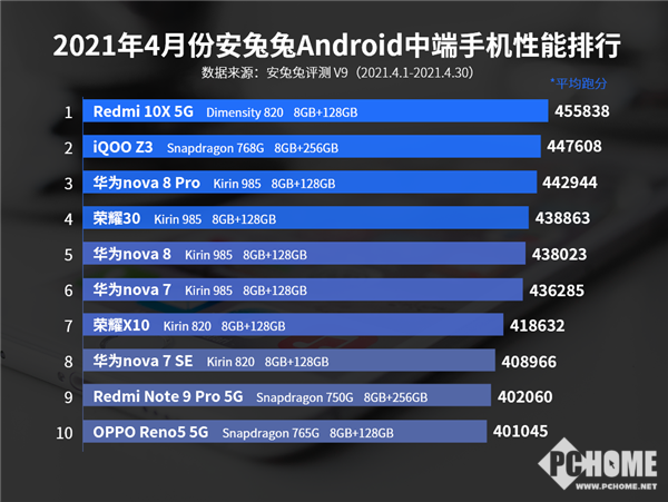 本次数据统计的时间为2021年4月1日到4月30日,榜单内成绩为统计到的平均成绩而非最高成绩,且单一机型数据统计量>1000条,数据均基于安兔兔V9版本计算,如果单一机型有多个存储容量版本上榜,则以最高分的版本为主。