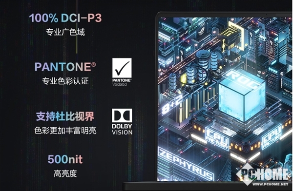 屏幕素质非常高,2560x1600 2K分辨率,165Hz刷新率,3ms响应时间并支持Adaptive-Sync技术,色域覆盖100% DCI-P3,并通过了Pantone色彩认证,还支持杜比视界Dolby Vision,亮度亦高达500nits。