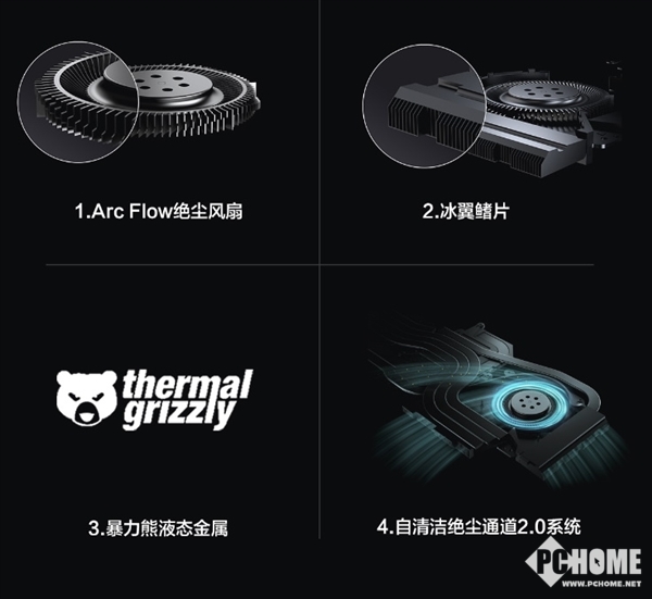改良的Arc Flow绝尘风扇,84片高强度LCP叶片,重新设计动力结构,特殊空气动力模式下可最大程度减低湍流和噪音,还有暴风增压系统,可切换不同场景模式,静音模式下CPU、GPU温度不足50°C时风扇停转。