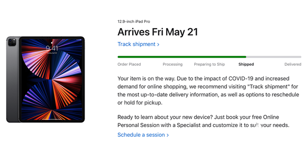 今年新发布的iPad Pro亮点还是比较多的,除了搭载了苹果自研芯片M1,还在影像方面进行了升级。订单状态显示,首批iPad Pro已经开始出货发运,最早5月21日抵达消费者手中。售价方面,iPad Pro 2021国行版11英寸的起售价为6199元(128GB),12.9英寸起售价为8499元(128GB)。
