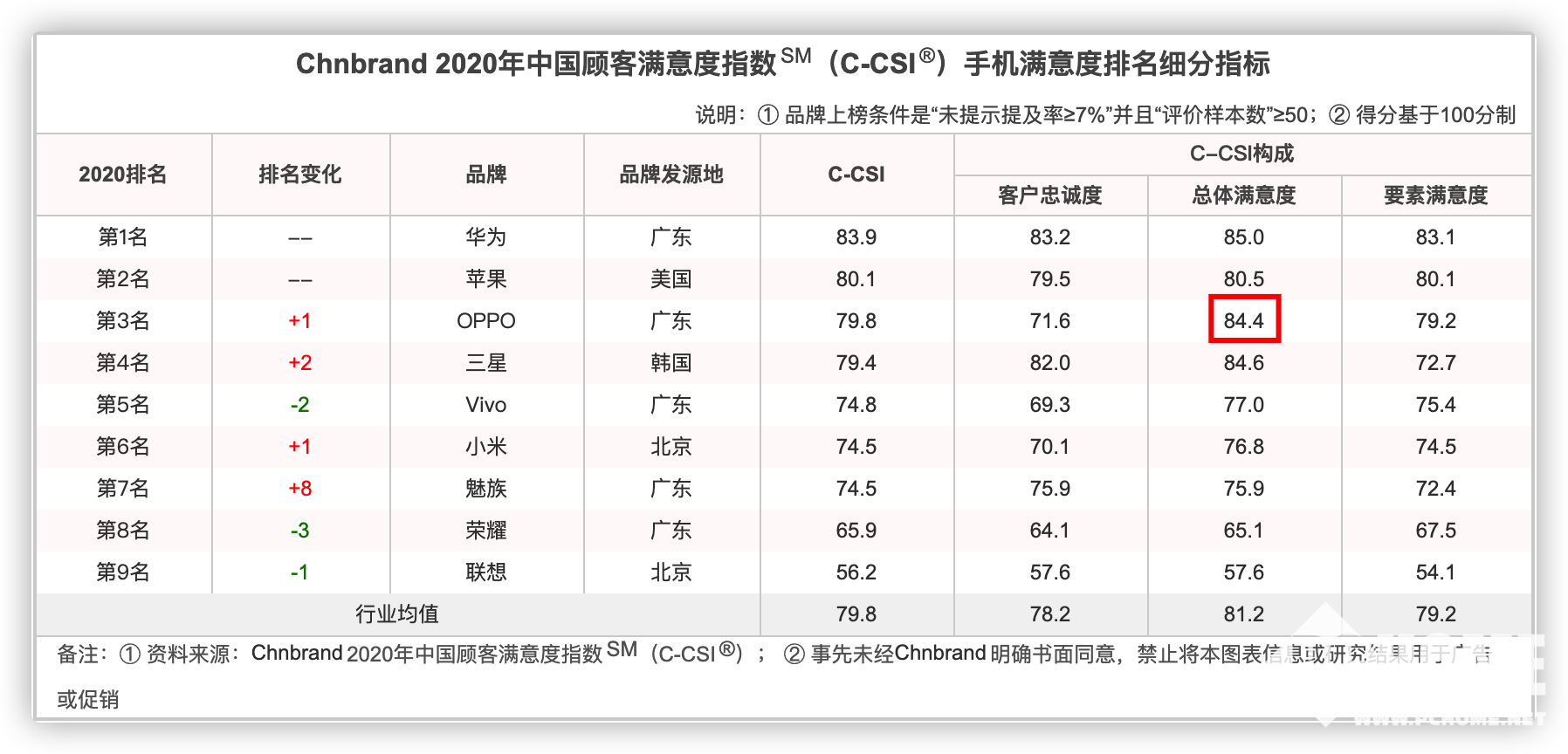 在2020年的消费者满意度数据排名中,华为与苹果分别以83.9和80.1的得分继续保持在1、2名,OPPO则以79.8的得分上升一位,超越三星跃居第三。