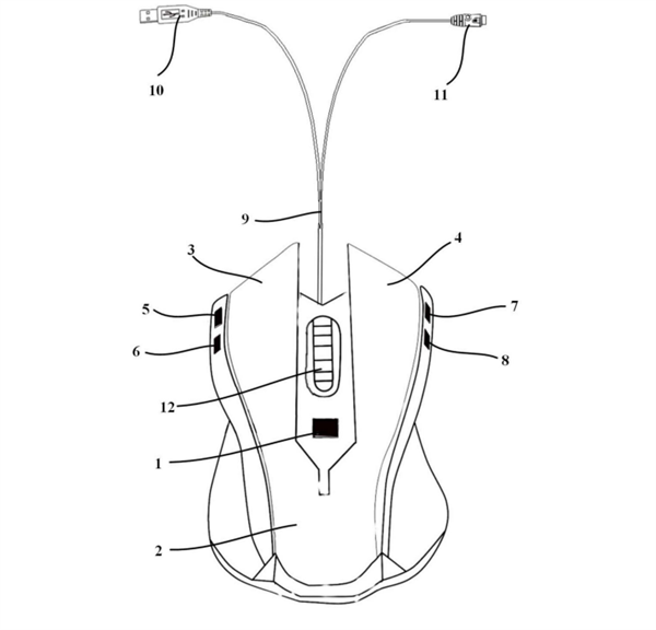 比亚迪介绍称,用户不安装专用驱动时,可为图中侧边键5、6、7、8赋予特殊的键值,分别对外输出“↑”、“↓”、“←”、“→”,使得所述多功能鼠标相当于一个微型模拟键盘。