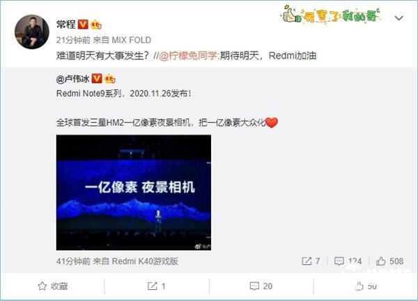 从以上信息来看,卢伟冰很可能是在暗示新一代的Redmi Note 10系列即将跟广大消费者见面。而随后小米集团副总裁常程也转发该微博并表示“难道明天有大事发生?”,更是增添了一丝可信度,并进一步显示该机有望在明天得到官宣。