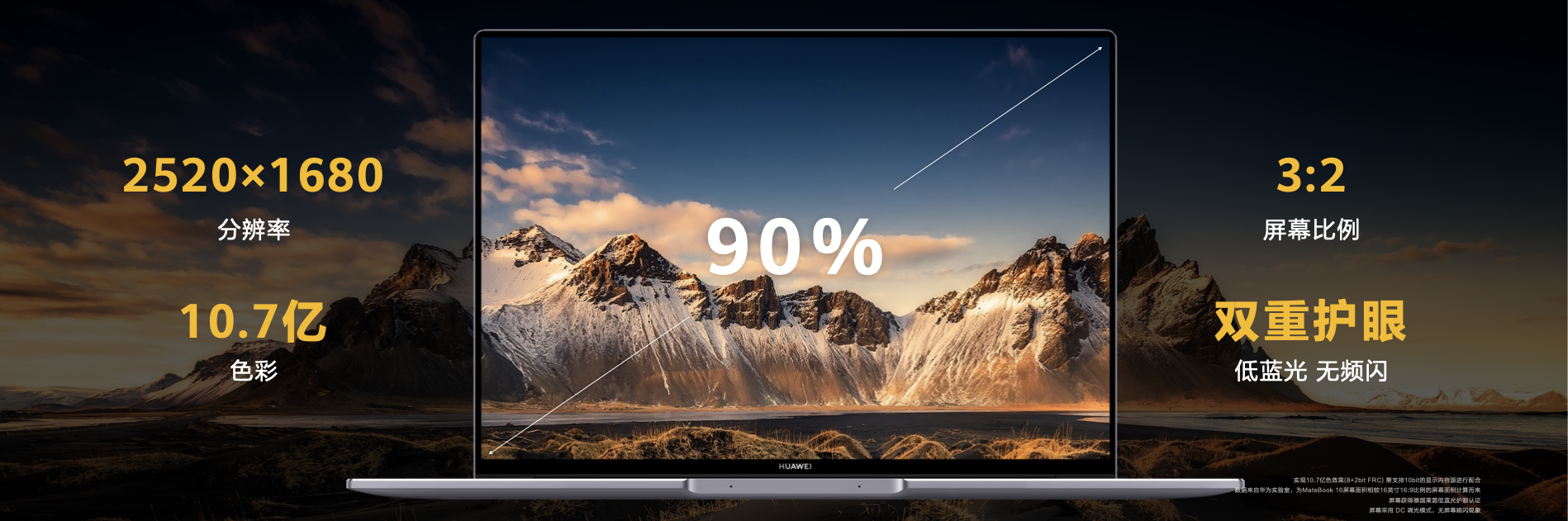 与此同时,华为MateBook 16采用DC调光的无频闪屏幕,并获得德国莱茵低蓝光认证,让用户感光舒适,眼睛更好地得到呵护。