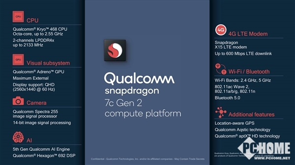 今天同步发布的第二代骁龙7c,集成两个Kryo 468 Gold、六个Kryo 468 Silver CPU核心,最高频率2.55GHz(初代为2.40GHz),集成Adreno 618 GPU、Spectra 255 ISP、Hexagon 692 DSP、骁龙X15 LTE基带,支持LPDDR4X-4266内存、Wi-Fi 5、蓝牙5.0,三星8nm工艺制造。