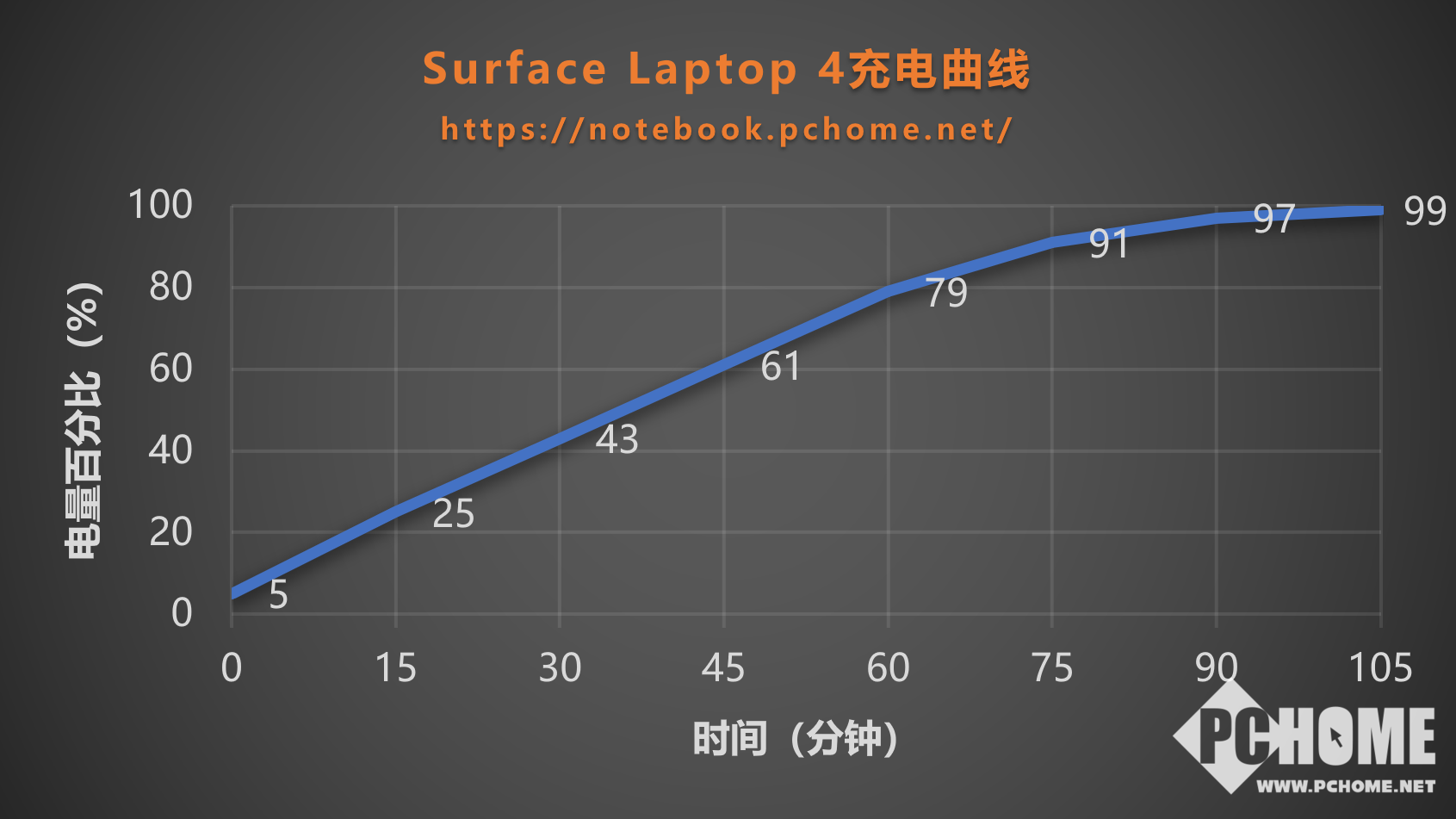 充电方面,Surface Laptop 4标配65W的电源适配器,通过专用磁吸接口进行充电,机器也支持USB-C接口快速充电。在我们进行的充电测试中,整个充电曲线比较线性,前半个小时内,可以充进38%的电量,60分钟可将机器充至79%,75分钟之后进入涓流充电阶段,系统显示99%电量时共计耗时105分钟,充电速度基本令人满意。