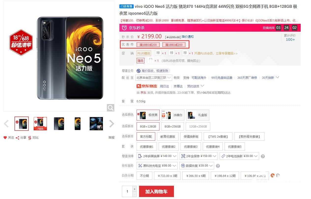 而这个价格并非是iQOO Neo5 活力版的极限,在京东商城中购买购机的话,不仅能够享受到首发期间的全线100元优惠活动,还有京东商城提供的满减券200元,两种活动叠加之下,iQOO Neo5 活力版最低仅1999元即可入手,这个价格的优势非常明显,是同价位之中最超值的选择了。