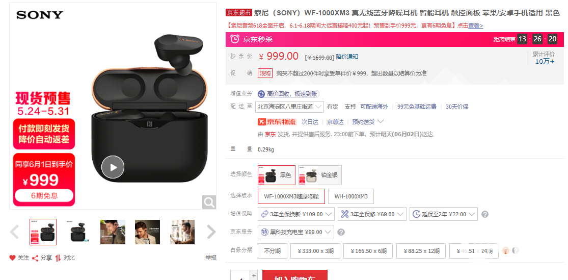 6月1号消息,索尼WF-1000XM3在两年前推出后,一直有不错的口碑,搭载HD降噪处理器QN1e,支持20级环境声可控降噪以及智能降噪、32小时续航、高音质体验等,之前的价格是1699,目前这款耳机618期间到手价仅需999,这个折扣力度非常之大了。此外还可以享受6期免息。