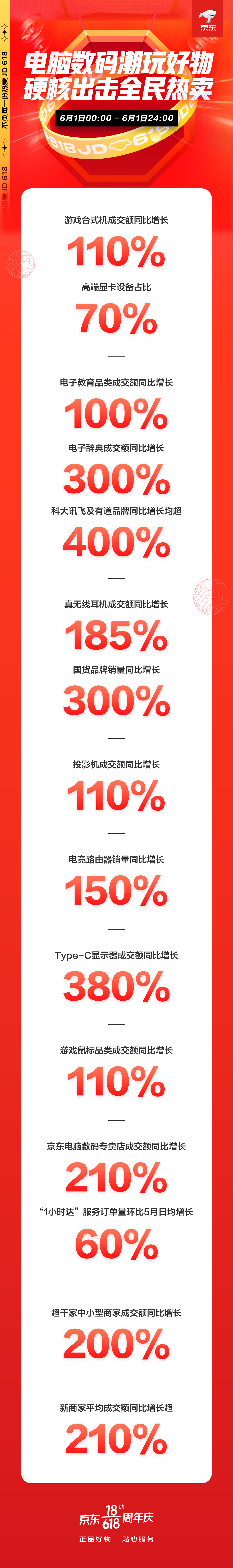 伴随着无数网友的激情下单,6月1日“京东618,18周年庆”喜迎开门红,备受消费者青睐的电脑数码会场更是火力全开,游戏、教育、影音等全品类全线飘红,再次刷新历史战绩。不难看到,凭借其高品质的产品和服务,京东电脑数码在推动用户消费升级、享受品质生活的过程,依旧稳占用户心智C位。