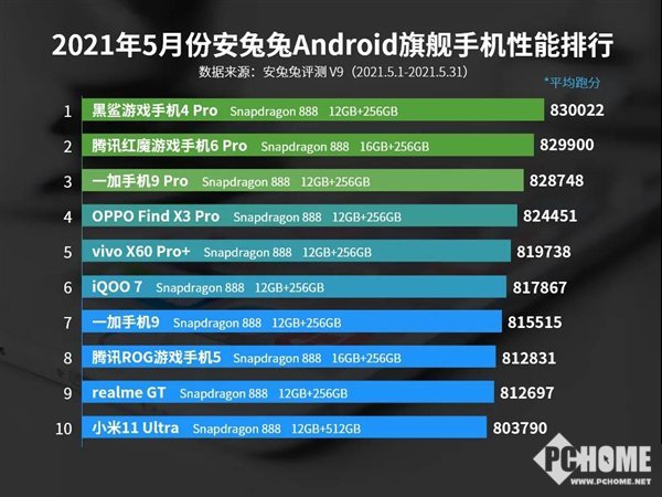 6月2日晚间,安兔兔公布了5月分安卓机性能排行榜,黑鲨4 Pro以83万分夺冠,该机已经持续榜首三个月,这在性能榜非常少见,是目前跑分最高的骁龙888机型。而小米11青春版则拿下了中端手机性能第一,跑分53万,是唯一一款跑分过50万的机型。