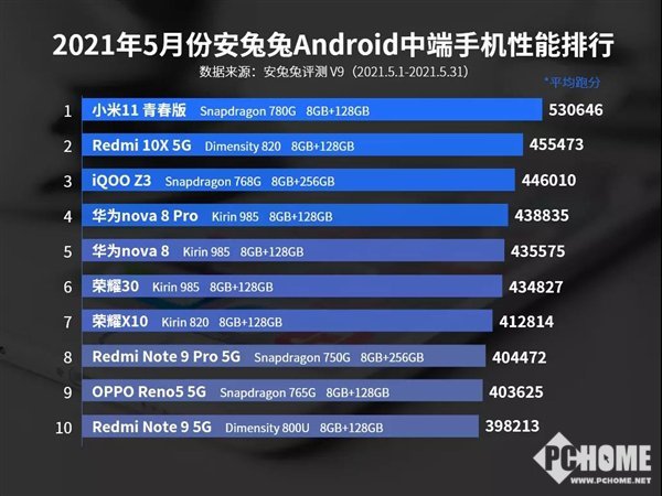 第二名机型是搭载天玑820的Redmi 10X,平均成绩为455473,在骁龙780G之前,该机一直是中端性能的领头羊。第三名机型是搭载骁龙768G的iQOO Z3。