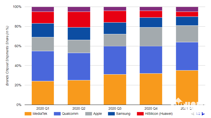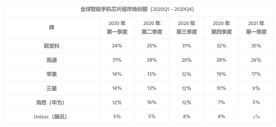 近年来,智能手机已从增量市场进入存量市场,5G的到来为手机市场的发展注入了强动力,5G手机芯片的需求也随之增加。市场研究机构Counterpoint于近日公布了全球智能手机AP(应用处理器)芯片市场份额的相关数据,2021年第一季度,联发科以35%的市场份额排名第一,同比增长11%,持续扩大了市场优势。