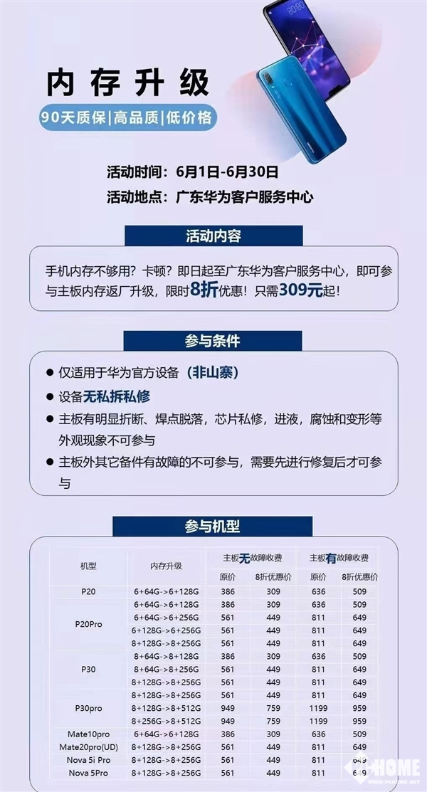 所谓“内存升级”,主要针对的ROM存储空间,图片显示参与机型目前有P20、P20 Pro、P30、P30 Pro、Mate 10 Pro、Mate 20 Pro屏下指纹、nova 5i Pro、nova 5 Pro这几款,其中64GB升级128GB最低只需309元。