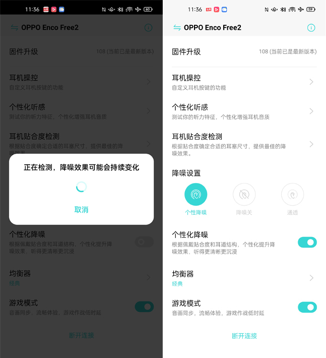 OPPO Enco Free2支持个性化降噪,为用户带来最适合自己的降噪效果。当开启后,耳机就会根据用户的耳道结构对降噪曲线进行优化,每个人的降噪参数都是不同的。值得一提的是,之前笔者使用的一些耳机支持的是自适应降噪、动态降噪等等,但用户没有主动权,不能选择把这个功能关闭或者开启,而OPPO Enco Free2可以让用户自由选择,非常人性化。