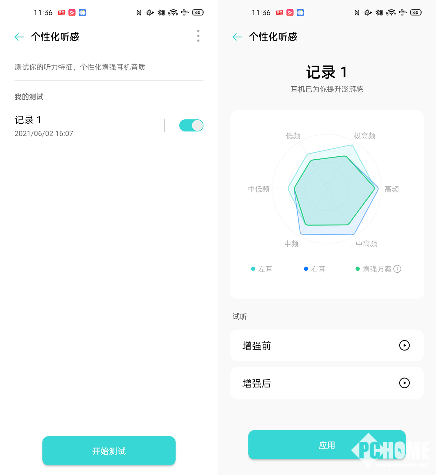 OPPO Enco Free2拥有一个非常不错的功能,就是个性化听感,用户可以对自己的听感进行几分钟的测试,包括对低频、中频和高频的感知。测试完成后OPPO Enco Free2就可以获取用户的听音敏感度,给出对应的补偿方案。比如笔者的右耳就对高频、中高频以及中频比较敏感,对极高频、低频以及中低频就不是那么敏感。根据这个曲线,OPPO Enco Free2会为用户定制听感增强方案,进行个性化的声音优化。用户还可以试听增强后的音乐,并且可以选择将这个方案应用到耳机,接下来每一次播放音乐都会使用这个音质听感方案。个性化听感功能可以让用户听到更加清晰且细节丰富的音乐,非常nice。