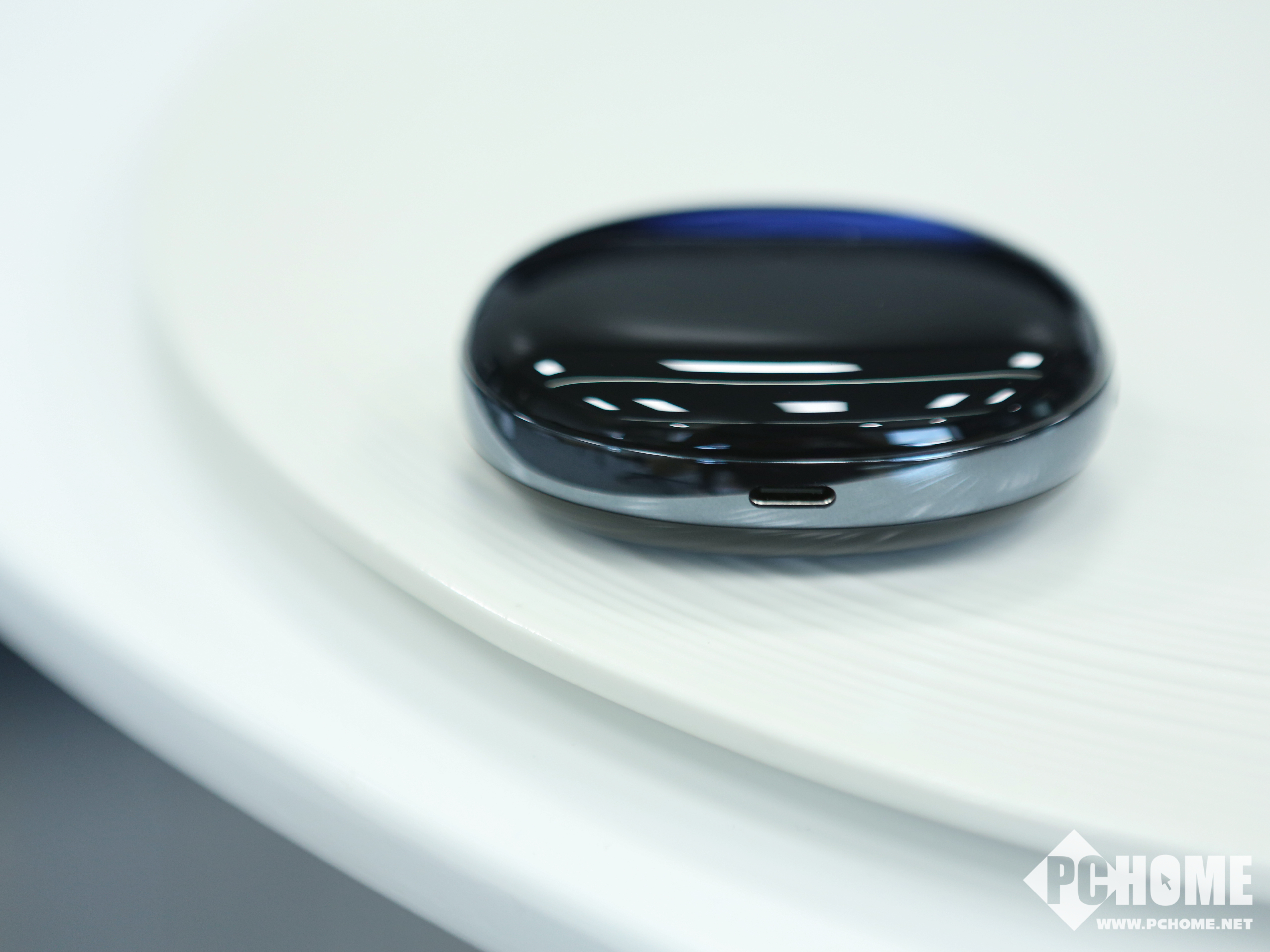 充电盒的正面有一个指示灯,侧面有一个功能按键,底部配备一个Type-C充电接口,可以和手机共用一条充电线。