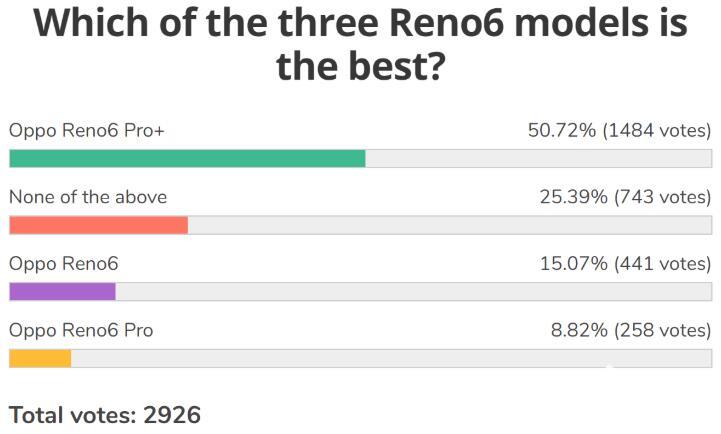 从数据上来看,有50.72%的用户认为OPPO Reno6 Pro+是该系列中的最佳,对于Reno6系列完全不看好的人数占比为25.39%,喜爱OPPO Reno6的用户有15.07%,而OPPO Reno6 Pro则排名垫底,仅有8.82%的用户选择该机。