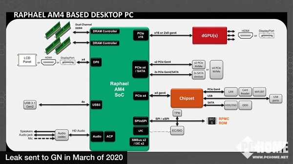 最后是Raphael平台架构图,确认继续支持PCIe 4.0,通道数量从24条增加到28条,其中16条分给独立显卡、4条连接PCIe/SATA SSD、4条连接芯片组(600系列)之后再扩展支持网卡、读卡器、Wi-Fi(蓝牙)、USB、硬盘、光驱等等。