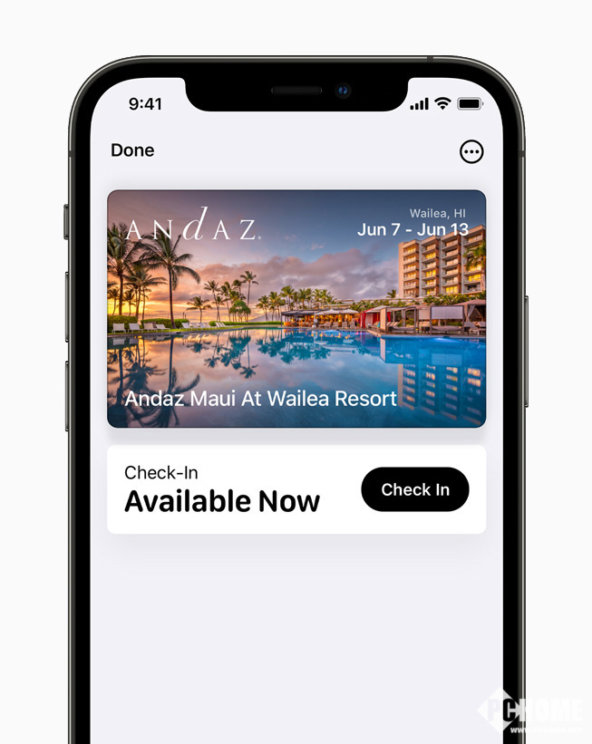 钱包 App 添加对更多钥匙类型的支持,让轻轻一点就能进入日常场所成为可能。去年夏天,Apple 推出了数字车钥匙,BMW 成为首家支持 Apple 数字车钥匙的汽车公司,让用户轻点一下就能解锁汽车。今年,有了超宽带技术的支持,数字车钥匙更加完善,用户现在无需从口袋或包中掏出手机就可以安全地解锁并启动受支持的汽车。用户还可以用 iPhone 解锁家庭、办公室甚至酒店房间,通过钱包 App 中存储的钥匙即可实现。