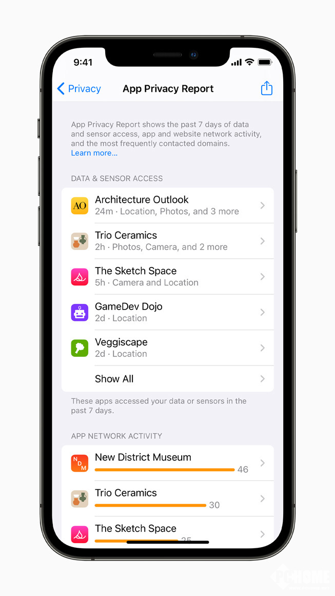 iOS 15 推出了更多的隐私控制选项来保护用户信息。通过设备端语音识别,Siri 请求的语音现默认完全在 iPhone 上处理 ,性能显著提升。邮件隐私保护让发件人无法得知收件人打开邮件的时间,并且隐藏了 IP 地址,所以发件人无法确认用户位置或用位置来建立用户档案。App 隐私报告概述了 App 如何使用过去七天内被授予的位置、照片、相机、麦克风和联系人访问权限,以及与哪些域名通信。