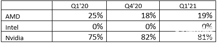 不过,在独显市场,NVIDA无疑还是当之无愧的老大,份额高达81%,其余19%则被AMD拿下。