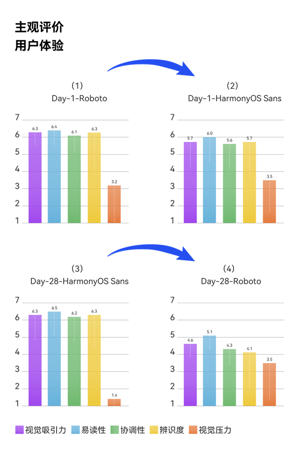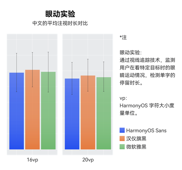 西文与Product Sans、Roboto进行对比,新字体平均注视时间均低于其他字体,HarmonyOS Sans中西文得易读性均得到了印证。