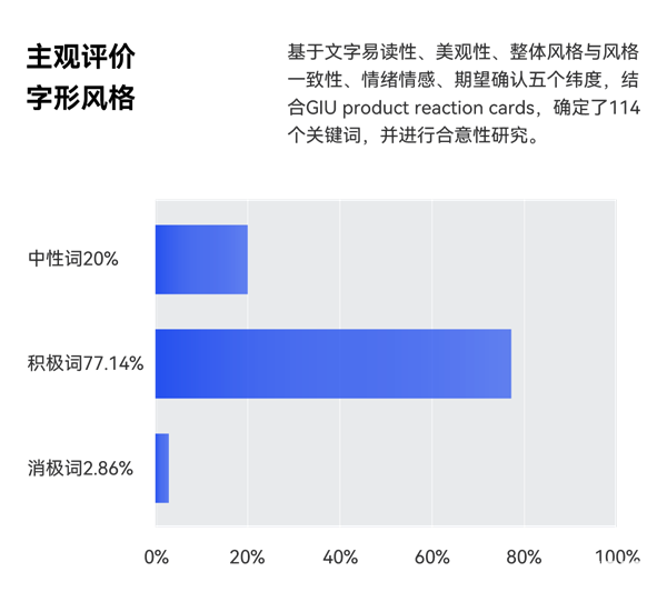 华为用户针对字形风格评价显示,用户评价高频词汇为:清晰的、中性的、优雅的、自然的、好看的、舒适的。