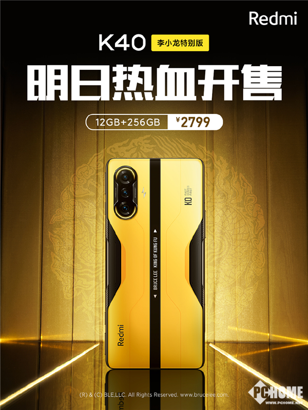 今日,Redmi手机官方宣布,K40李小龙版将于明日再次开售。这部以传奇功夫巨星李小龙命名的特别版,机身采用李小龙标志性的黄黑色设计,手机壳、充电器以及数据线均为纯黄,同时随机还有一份李小龙纪念册。