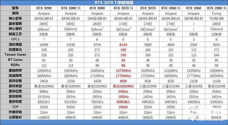 为了应对高功耗的GDDR6X显存,NVIDIA将RTX 3070 Ti的预设TDP提升到了290W,这是有史以来功耗最高的70显卡,比RTX 3070高了70W之多。