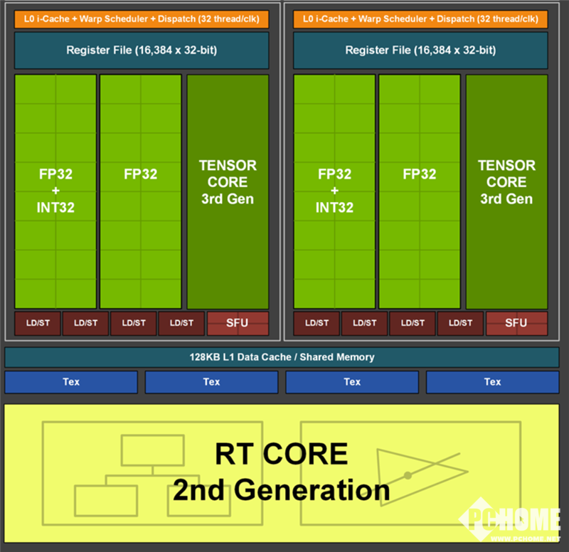 由于当今的游戏中对于FP32的需求越来越多,因此在Ampere架构上采用了更灵活的设计,原本只能计算INT32的流处理器中有一半可以更灵活的执行FP32或INT32。