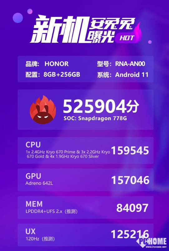 近日,安兔兔在其后台数据中发现一款疑似荣耀50系列的机型,型号为RNA-AN00。新机的CPU成绩159545分、GPU成绩157046分、UX成绩84097、MEM成绩则是125216,而且安兔兔推测,新机配备的应该是LPDDR4X内存以及UFS 2.x的存储芯片,屏幕刷新率则为120Hz。