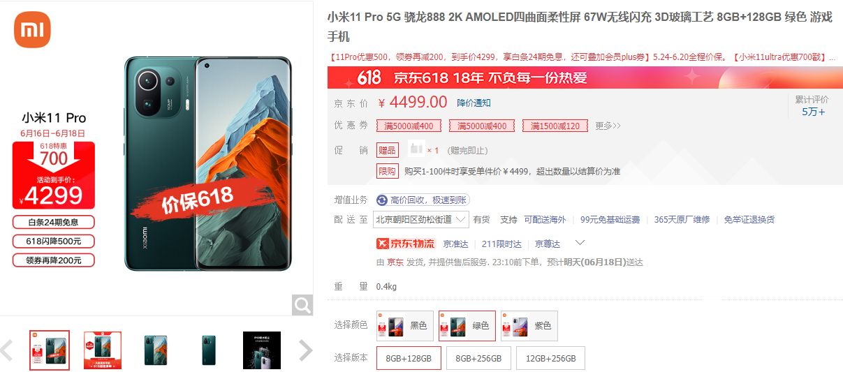 小米11 Pro 8GB+128GB,可实现无线充电,拍出夜景十分惊艳,相机录制效果超级棒,音质和画质技术都可谓超一流,在各项性能上都做到惊艳。现在,小米11 Pro 8GB+128GB 优惠500,领劵再减200,到手价4299元,享白条24期免息,还可叠加会员plus劵享更多优惠。