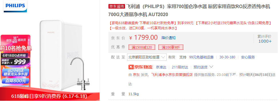 飞利浦家用700加仑净水器,其RO滤芯寿命高达3年,滤芯用的时间长能帮消费者省一笔钱,还能高效除菌、除病毒、除重金属,给老人和孩子喝都放心。这款飞利浦家用700加仑净水器18日到手999元,下单前10名付款抢免单,前2小时下单送159元糖果水龙头,可享白条12期免息,这等优惠不容错过,要买净水器的要抓住机会!