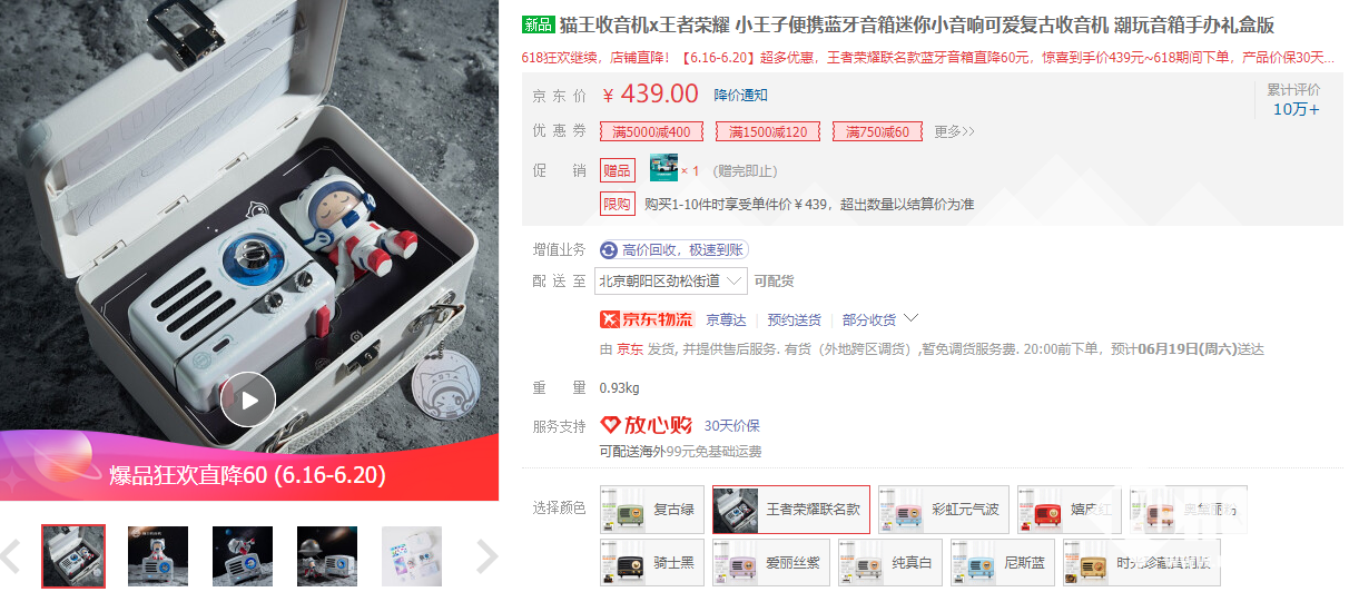 除五折秒杀产品外,其他电脑数码产品京东618价格也相当划算,不容错过。比如猫王收音机x王者荣耀联名款便携蓝牙音箱礼盒,机身与图案灵感来源自鲁班七号星空梦想荣耀典藏皮肤,礼盒还包含贴纸和公仔。京东618期间王者荣耀联名款蓝牙音箱直降60元,到手价仅需439元,喜欢这款联名款的小伙伴要抓紧时间入手了!
