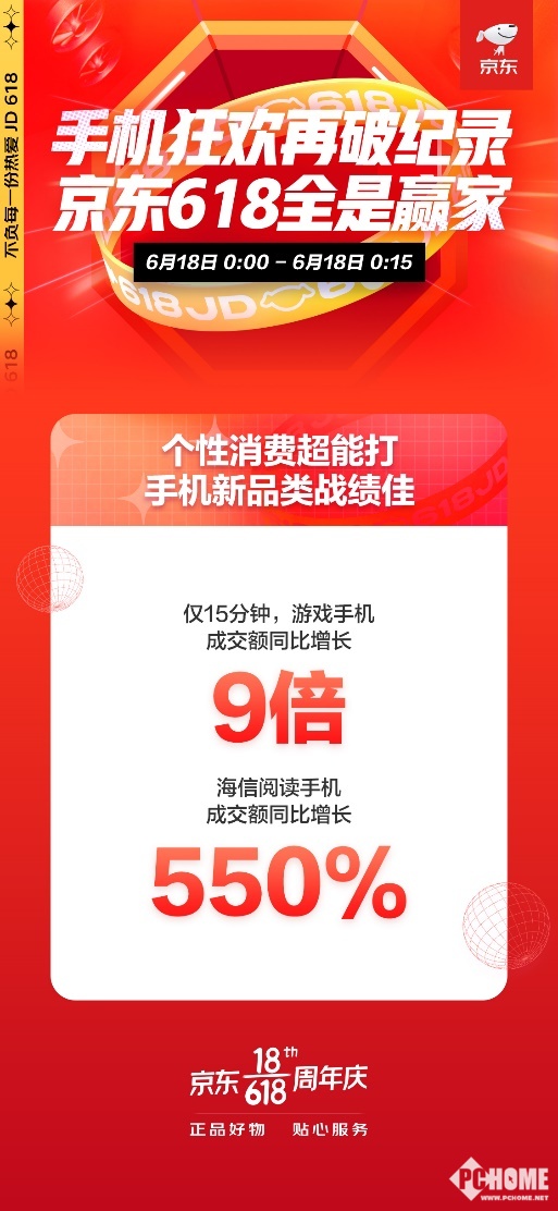 游戏手机、阅读手机的推出成功铸就了一个手机新品类,不仅为手机行业开辟了发展新方向,并且成功吸引了大批的游戏粉丝关注抢购。在今年京东618开门红打响之际,京东手机新品类便已表现抢眼,游戏手机品类成交额同比增长8倍,阅读手机更是取得成交额同比增长450%的喜人战绩。