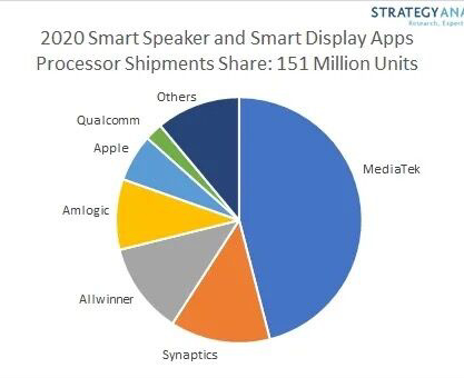 据Strategy Analytics报告显示,2020年全球智能音箱和智能屏幕产品销量创纪录,突破1.5亿台。该报告中进一步指出联发科占有了近50%智能音箱和智能屏幕设备的芯片市场份额。