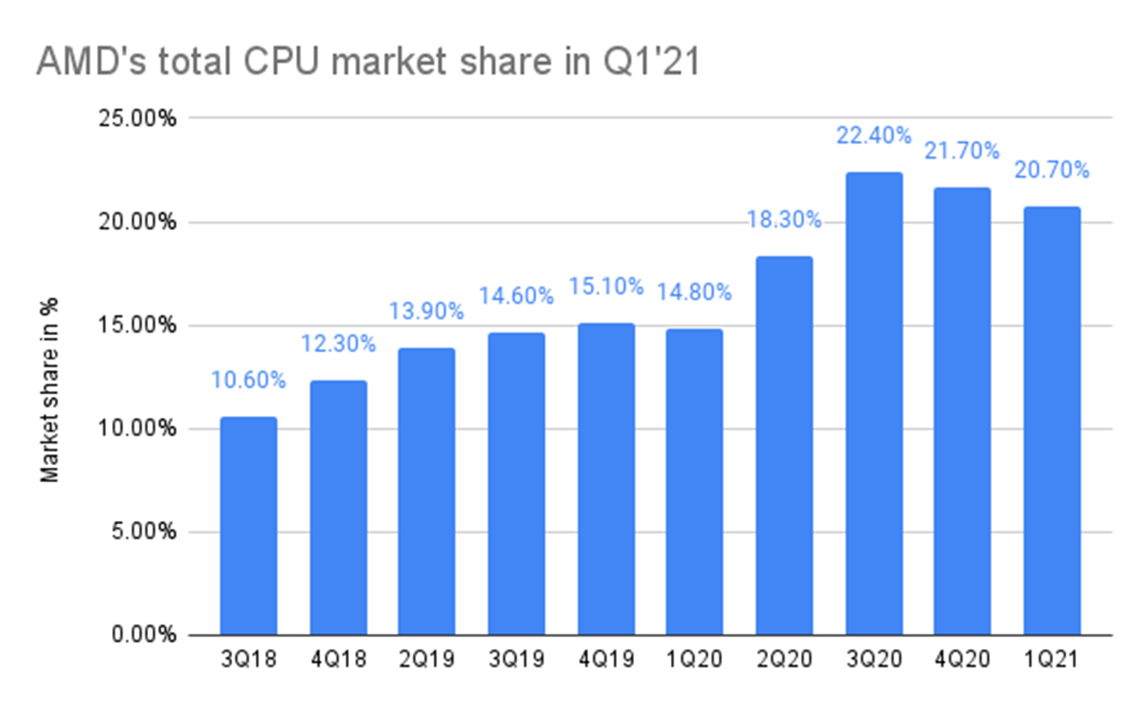 近日有国外调查机构汇总了AMD三年来的市场份额变化,2018年Q3季度AMD在整个x86市场上的份额恢复到了10.6%,突破两位数大关。之后一直稳步上涨,其中2020年Q3季度最高达到了22.4%的份额,不过从去年底到今年Q1季度份额有所下滑,目前还有20.7%的份额。