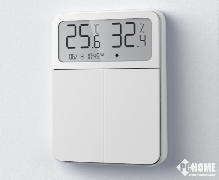 小米米家屏显开关内置温湿度传感器,通过屏幕,用户可以看清房间内的温湿度,可以接入米家App联动室内的空调、加湿器等。此外,用户还可以通过开关上的屏幕,查看日期时间、室外天气等。