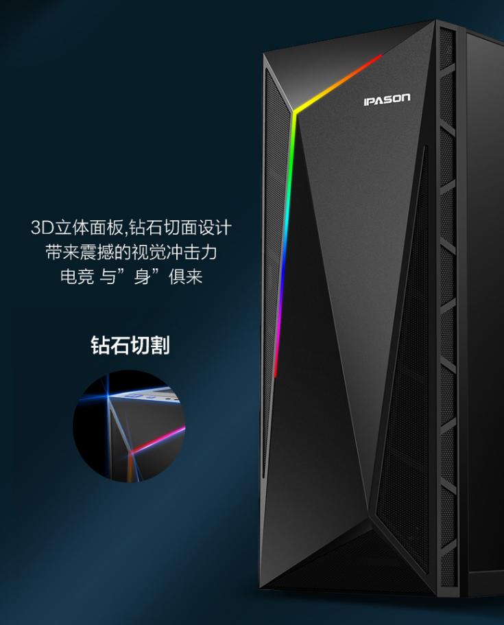 攀升G2台式机在机身设计风格上显得更加炫酷帅气。机身正面拥有两条RGB灯带,支持1680万色显示,支持多种显示模式,打造出流光溢彩的光影效果。机身正面由几个3D面板组成,再辅以钻石切面设计,带来更加立体的质感和更具冲击力的视觉效果。