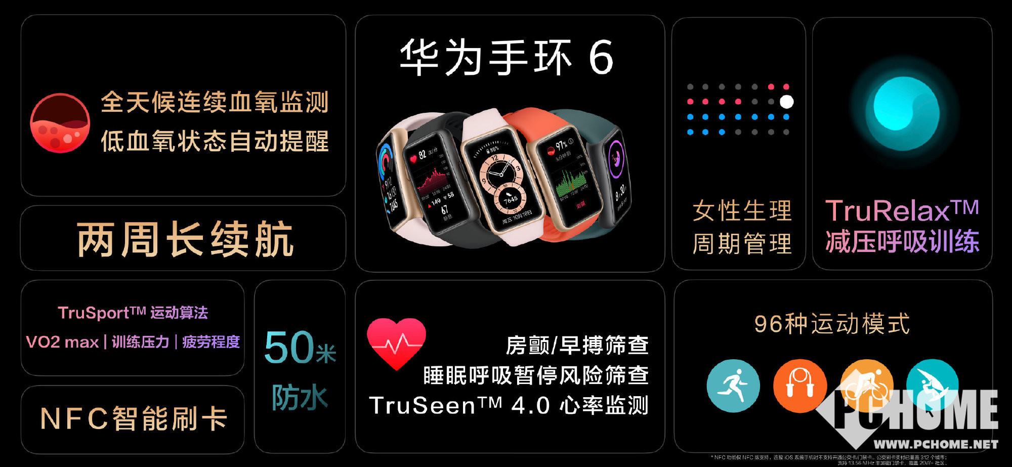在健康方面,华为手环6支持全天候血氧监测,当用户低血氧的时候手环会发出震动提示;支持全天候智能心率监测,当用户在运动过程中心率过高的时候,手环就会自动提醒用户降低运动强度。另外,华为手环6还支持睡眠呼吸监测、女性健康管理、压力监测等等。