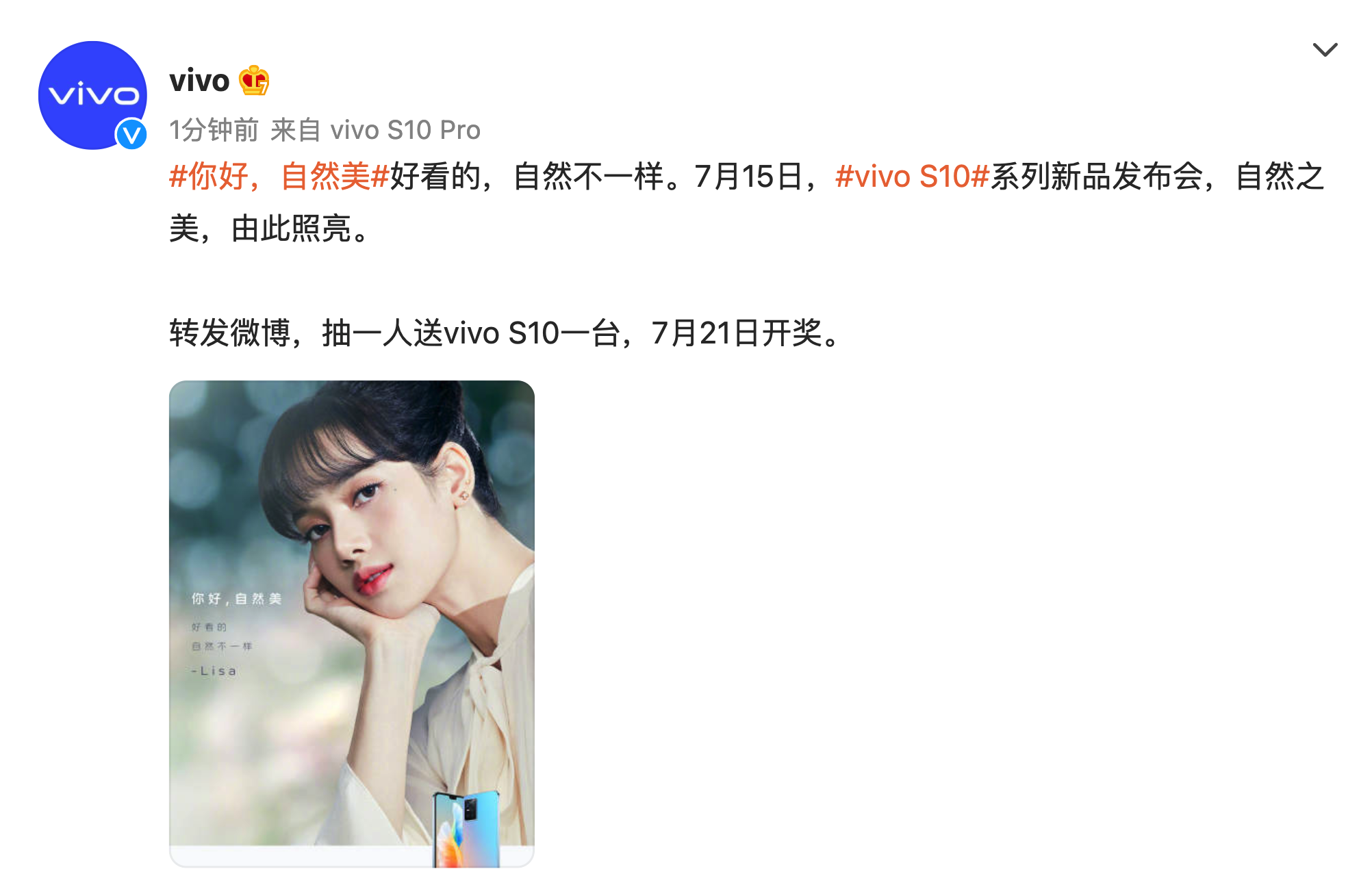 7月13日,vivo官方微博发布了名为“你好,自然美”自拍态度系列海报。vivo S10系列三位代言人携手张婧仪、mandarin乐队和9位KOL表达他们的“自拍态度”,为即将发布的vivo S10系列新机助阵。