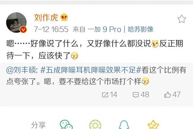 7月13号消息,一加科技COO刘丰硕在微博话题“五成降噪耳机降噪效果不足”中发表内容“要不要给这个市场打个样”,之后一加科技CEO刘作虎转发微博表示“期待一下,应该快了”,似乎在暗示一加首款TWS主动降噪耳机即将发布,目前刘作虎已经删除了这条微博。