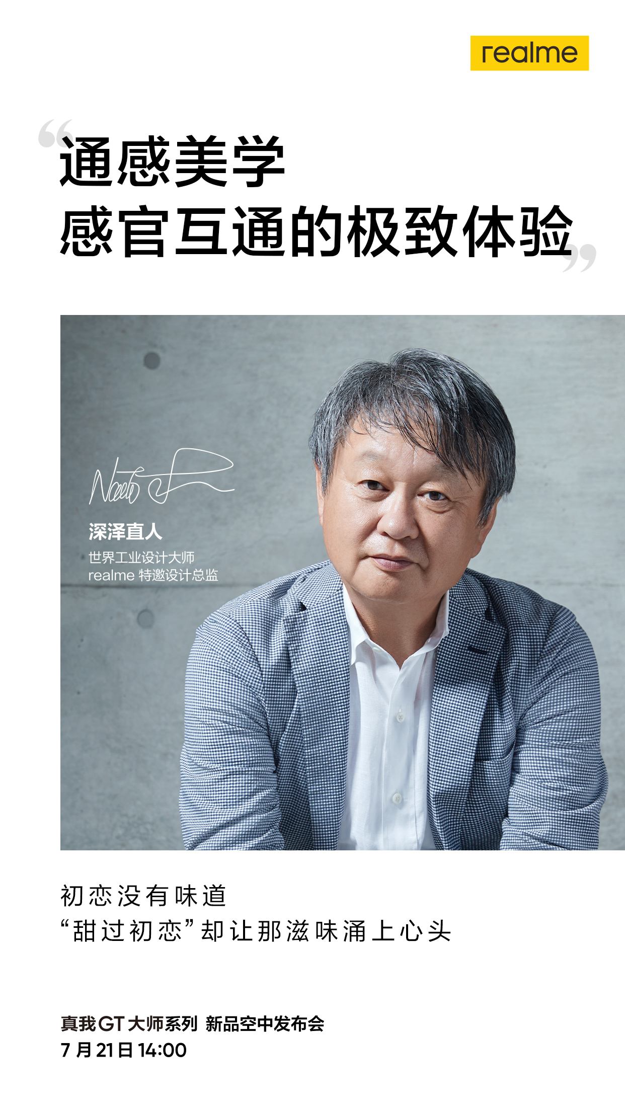 近日,realme真我宣布,将于7月21日举办真我GT大师系列新品“空中发布会”,发布全新的真我GT大师版与真我GT大师探索版。这是继“洋葱&白蒜”与“红砖&水泥”等大师版经典手机设计之后,realme与国际知名工业设计大师深泽直人再一次鼎力合作。