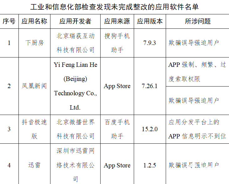根据通信部放出的名单来看,下厨房、凤凰新闻、抖音极速版、迅雷、虎牙直播、蜻蜓FM等等知名App赫然在列,涉及问题包括欺骗误导强迫用户,APP强制、频繁、过度索取权限,应用分发平台上的APP信息明示不到位,违规收集个人信息等等。
